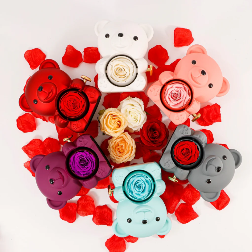 Incluye el majestuoso collar en una caja de regalo con un osito y una rosa real preservada, creando una presentación impactante.